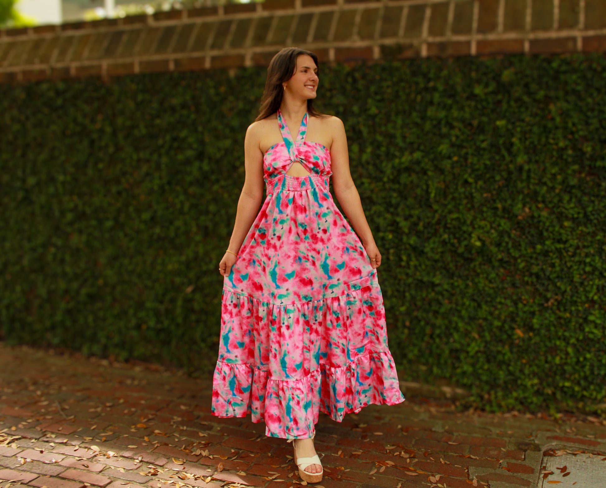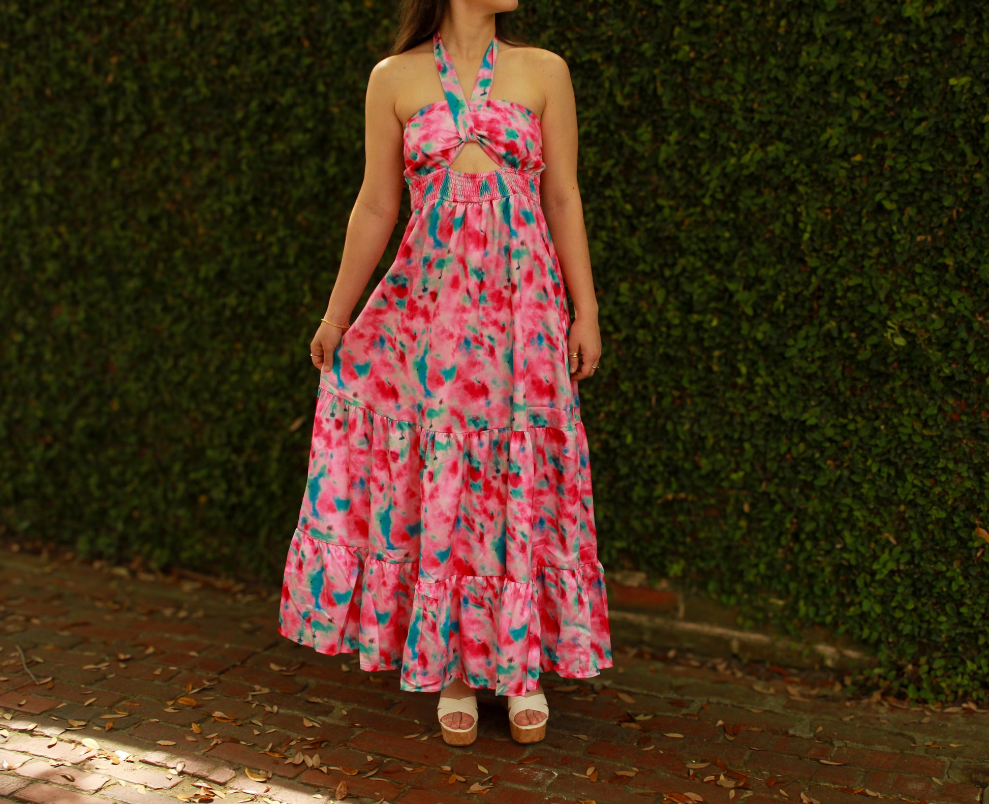 The Junie Halter Maxi Dress is perfect for any occasion. The cute pink and blue design adds a touch of fun to the classic maxi style. The halter neckline provides a flattering shape while the lightweight fabric ensures comfort. Perfect for a day out or a special event, this dress is a must-have for any fashion-forward wardrobe.