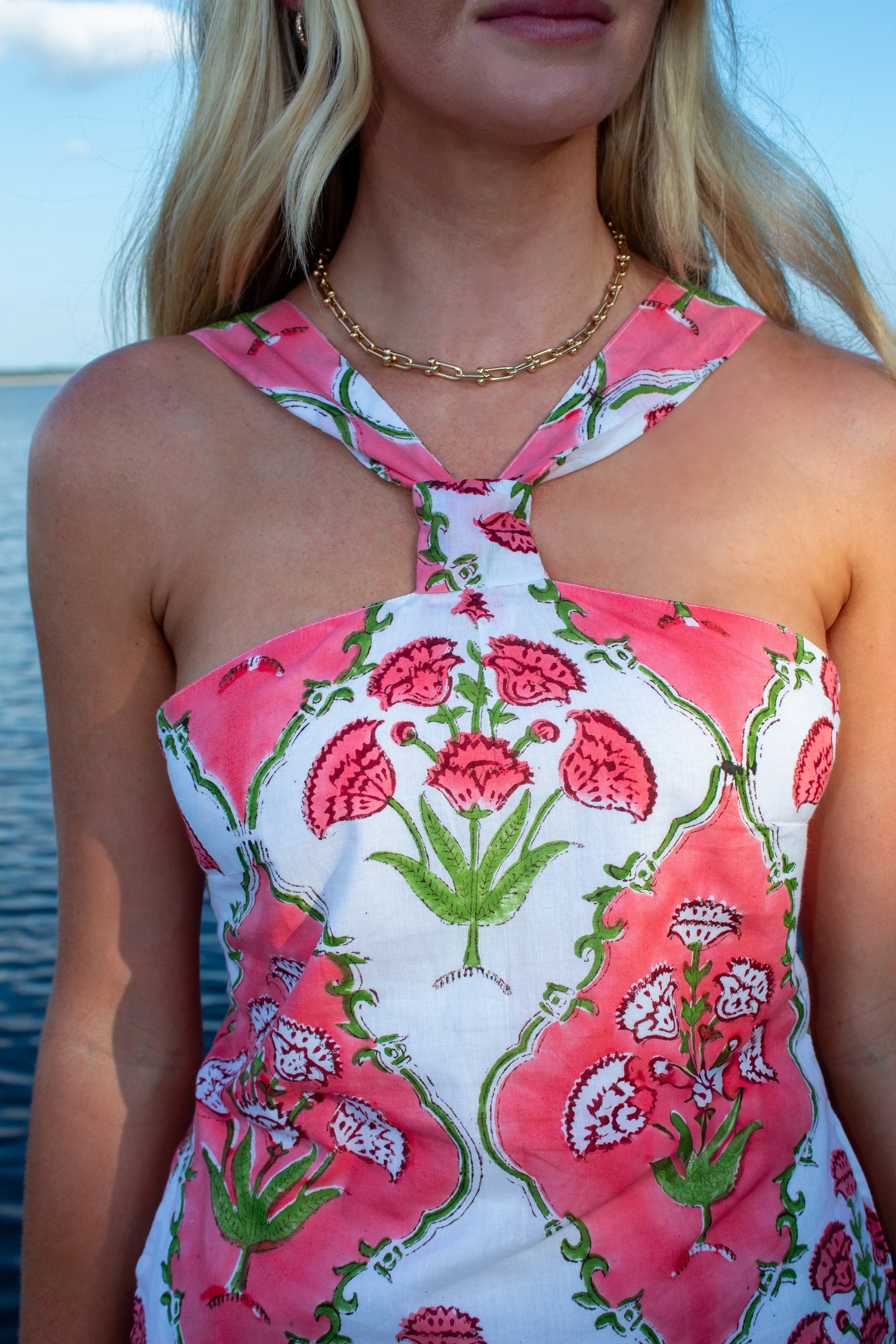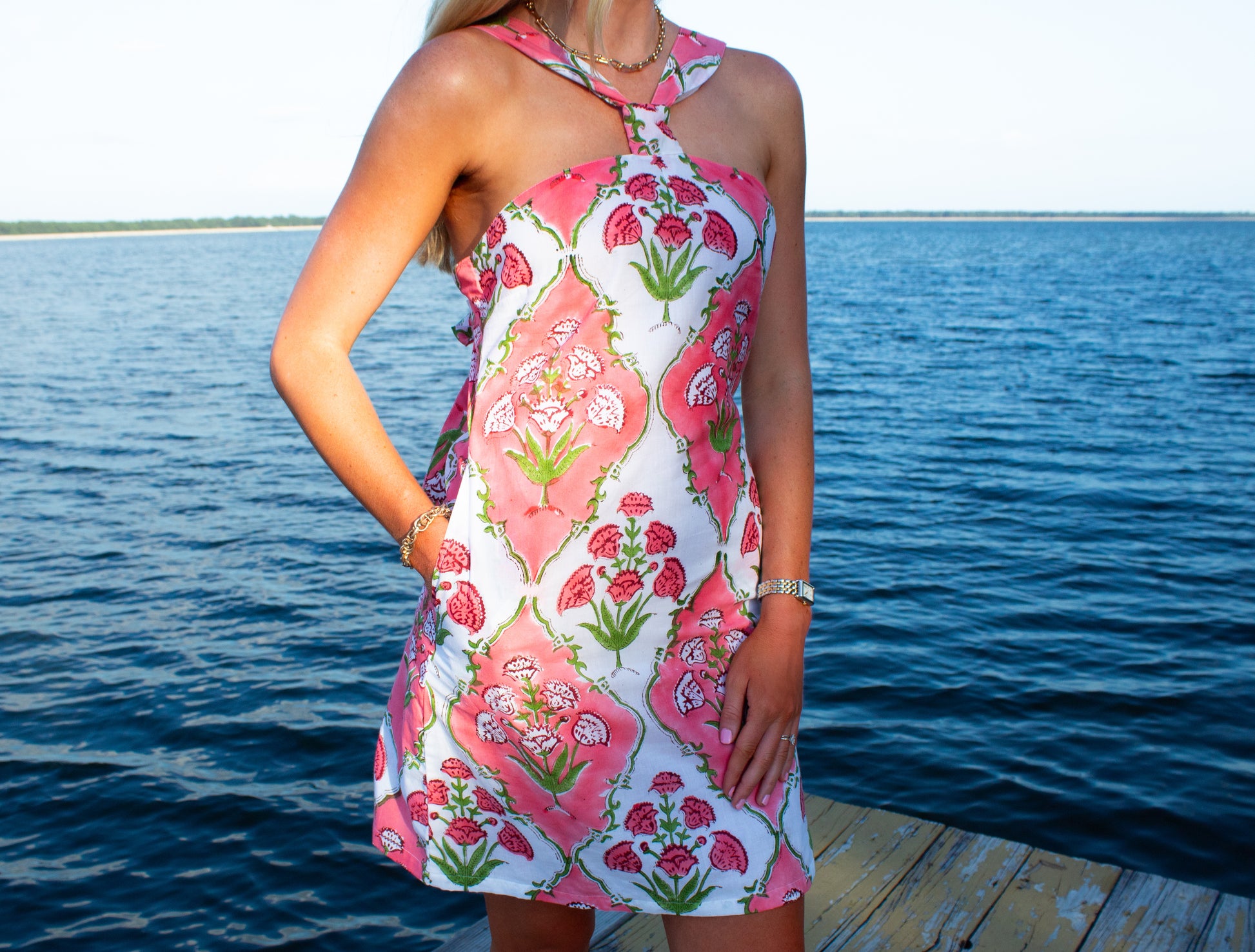 The Nantucket Bloom Mini is a summer standout, crafted from 100% cotton and adorned with a vibrant hand block floral print in coastal pinks and greens. Its halter neckline and breezy A-line silhouette make it effortlessly flattering, while hidden pockets add a touch of everyday practicality. Whether you’re wandering through seaside markets or soaking up golden hour on the dock, this mini was made for sun-drenched moments.