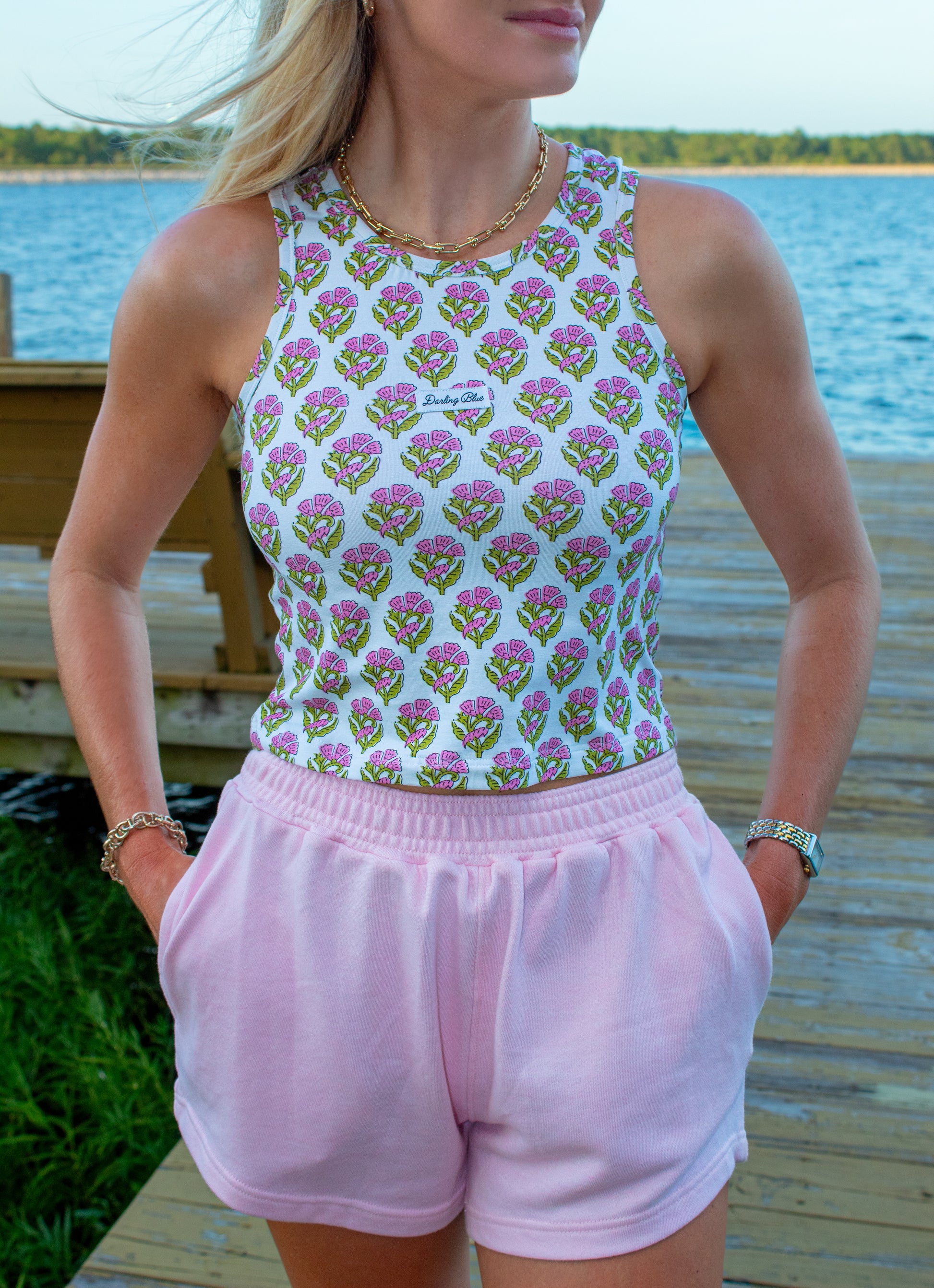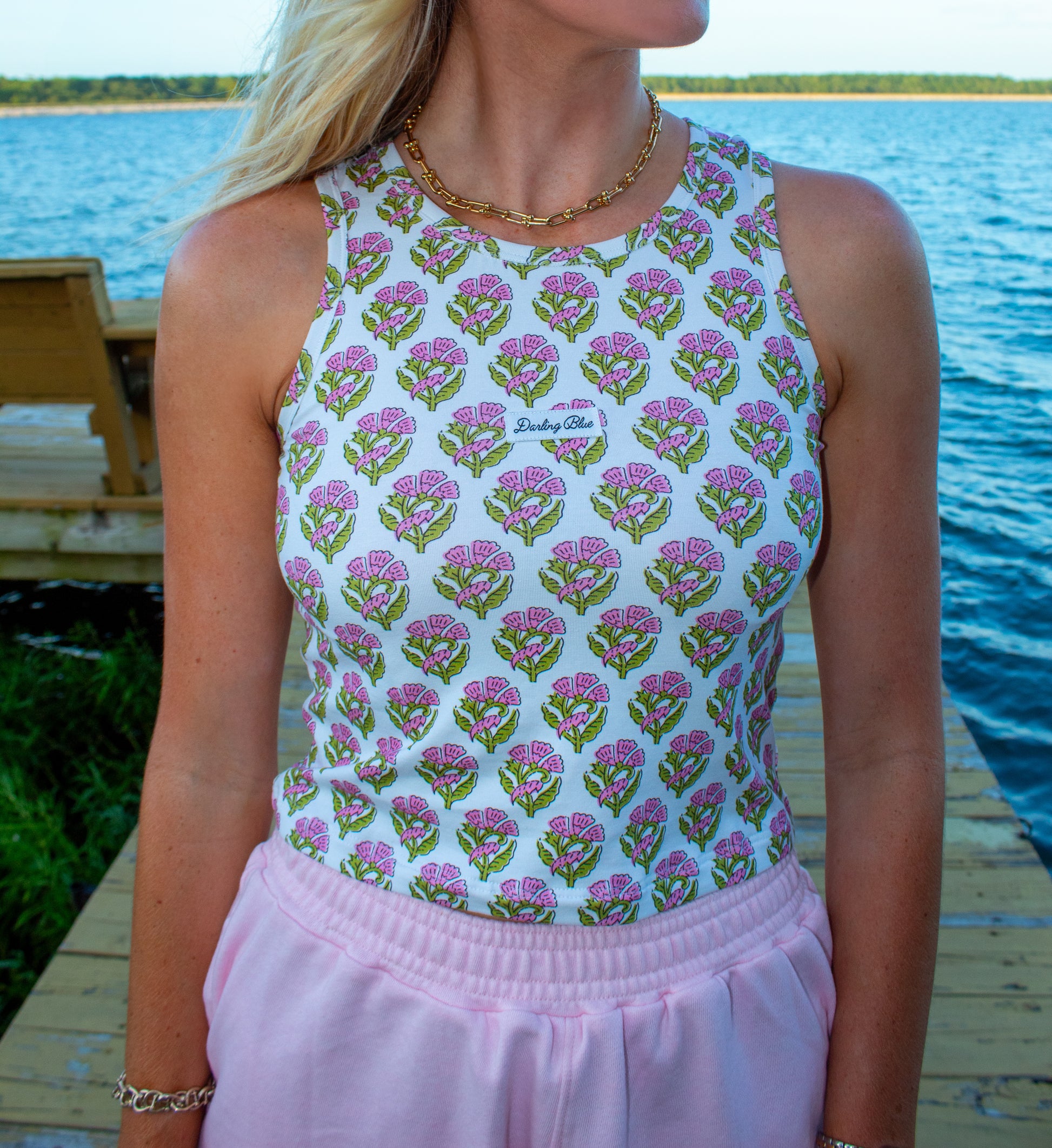 This tank is everything sweet summer days are made of. The Darling Summer Blushing Pink Tank is crafted from 100% cotton and features a soft floral print in pink and green, finished with our signature Darling Blue logo at the chest. Lightweight and breathable, it’s perfect for morning coffee on the dock or golden hour walks by the lake.