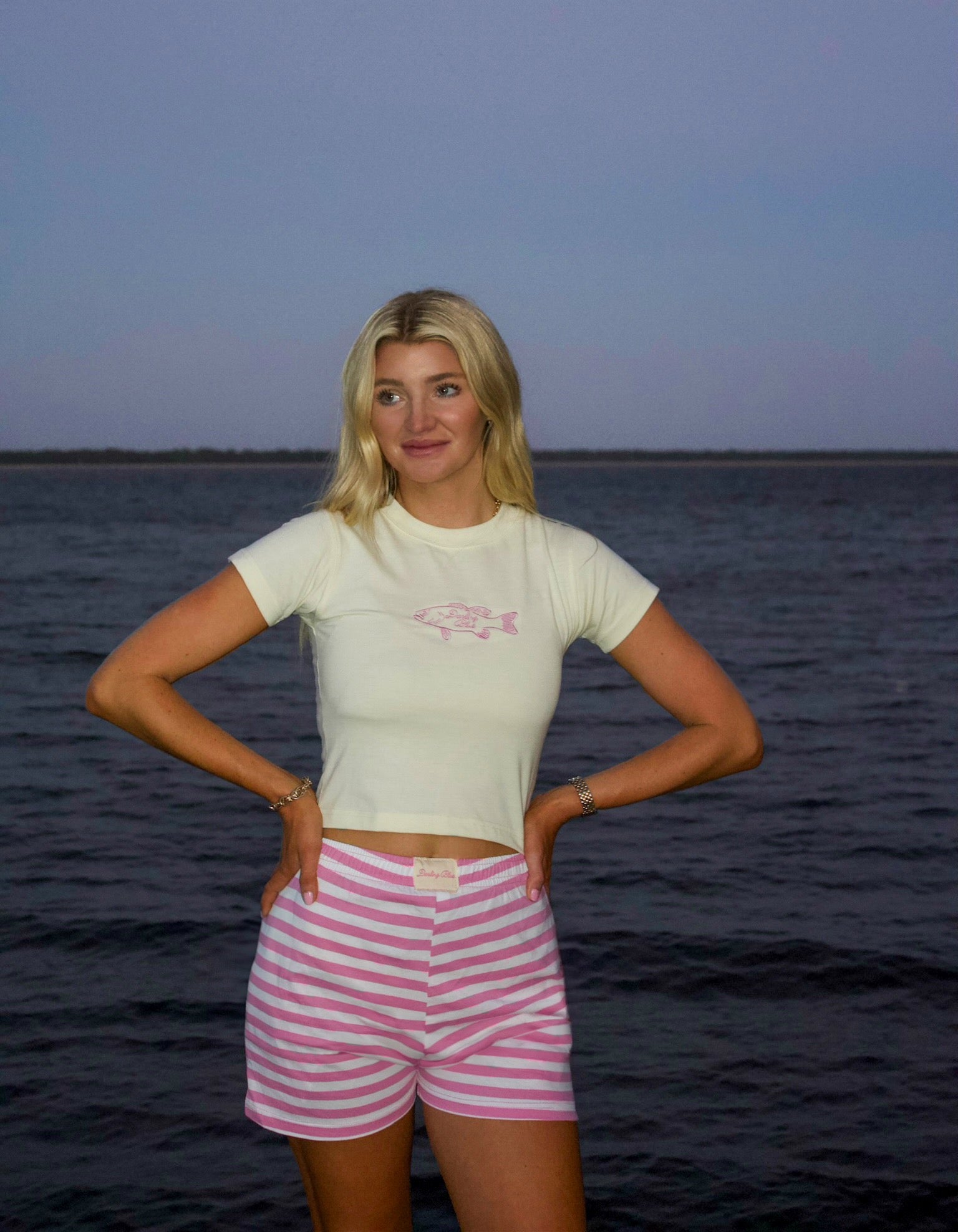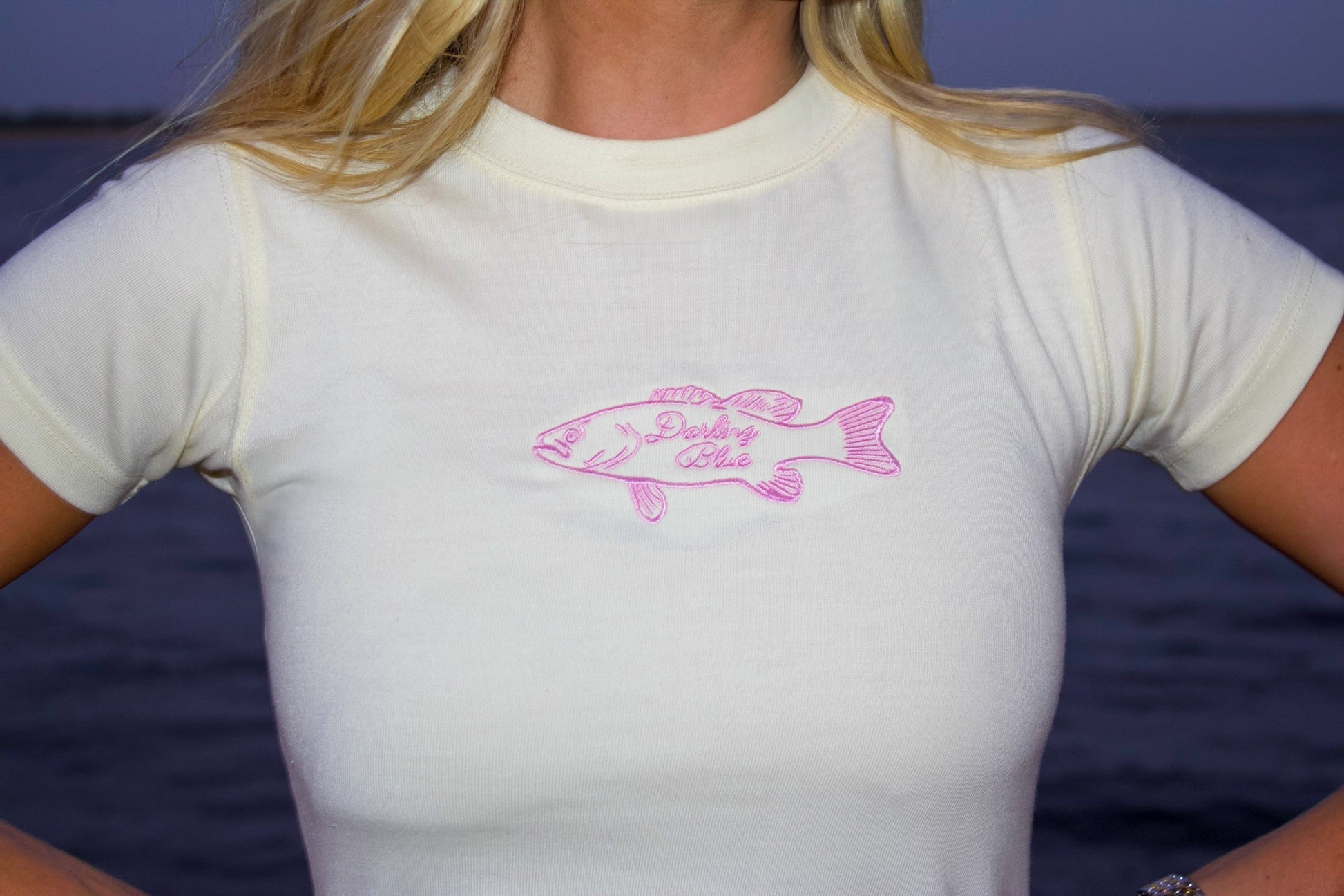 Made for long summer days and breezy lake nights, the Reel Darling Baby Tee is your new warm-weather go-to. Crafted from 100% cotton for the softest feel, this butter yellow tee features a delicate pink embroidered fish with our signature Darling Blue touch. Lightweight, breathable, and effortlessly cute.