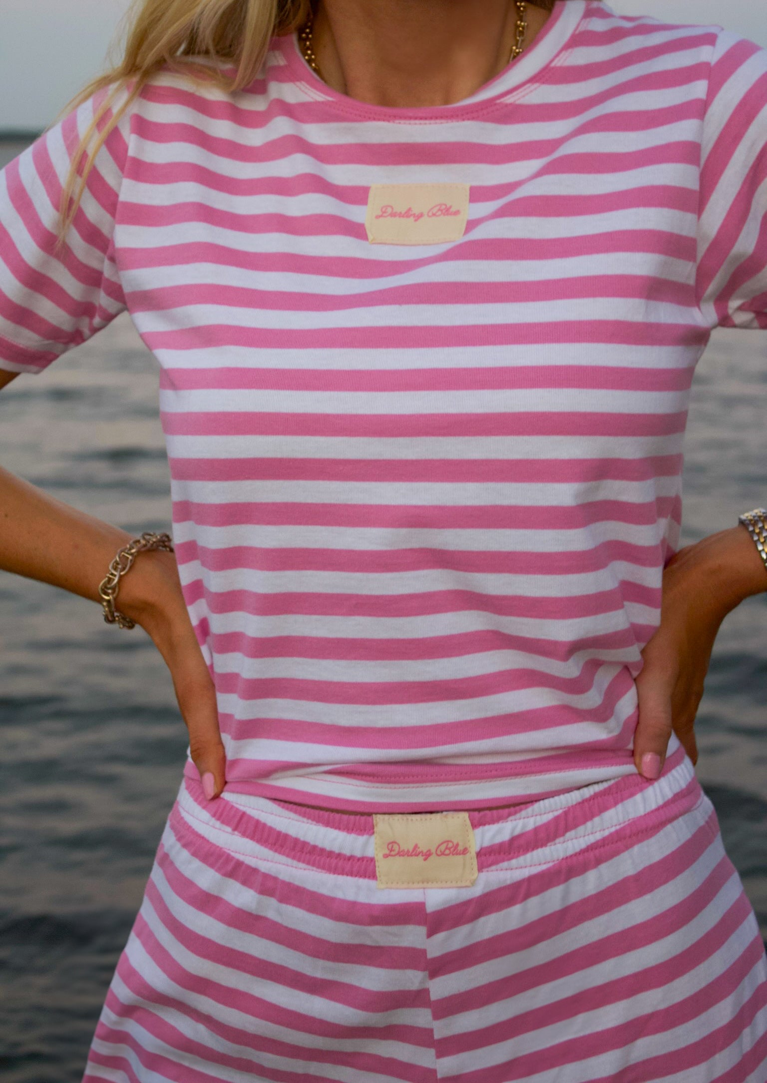 Inspired by soft sunsets and summer sips, the Sunset Spritz Tee is your new go-to for effortless days by the water. Made from breathable 100% cotton, it features a classic pink and white stripe and a relaxed, easy fit. Finished with our signature Darling Blue logo tag, it’s the perfect pairing piece, wear it with the matching shorts or style it your own way. These stripes are always in season.